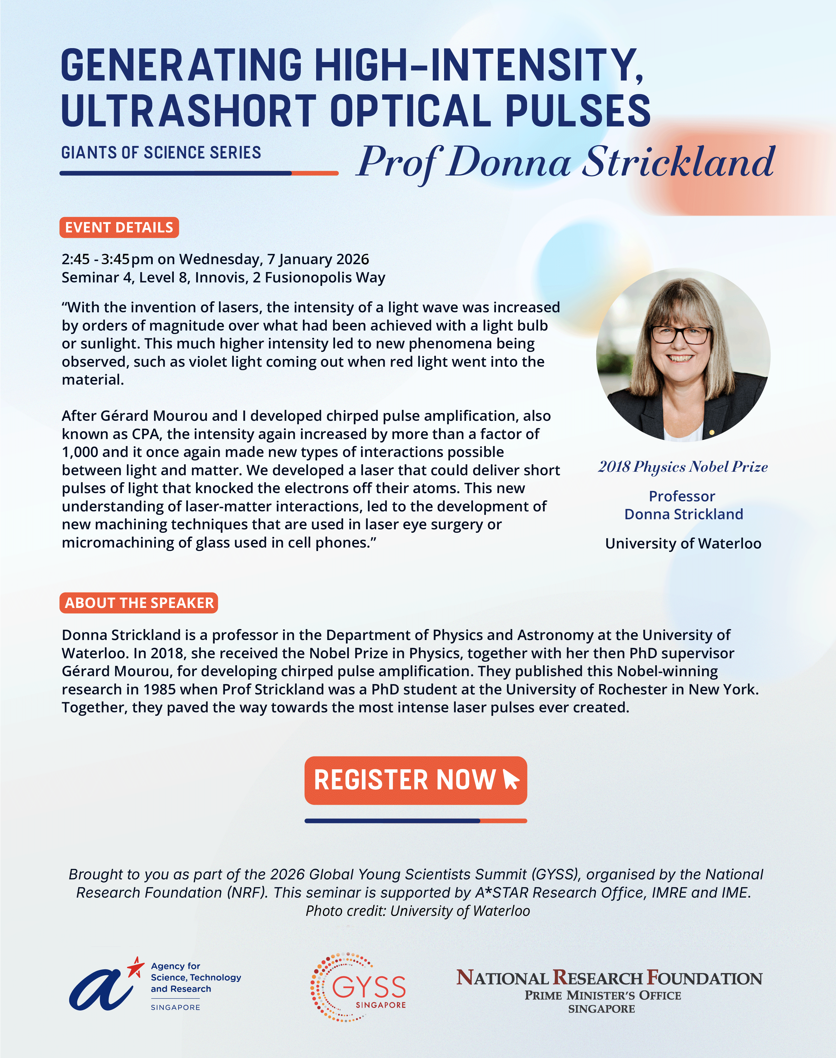 Generating High-Intensity, Ultrashort Optical Pulses – Prof Donna Strickland